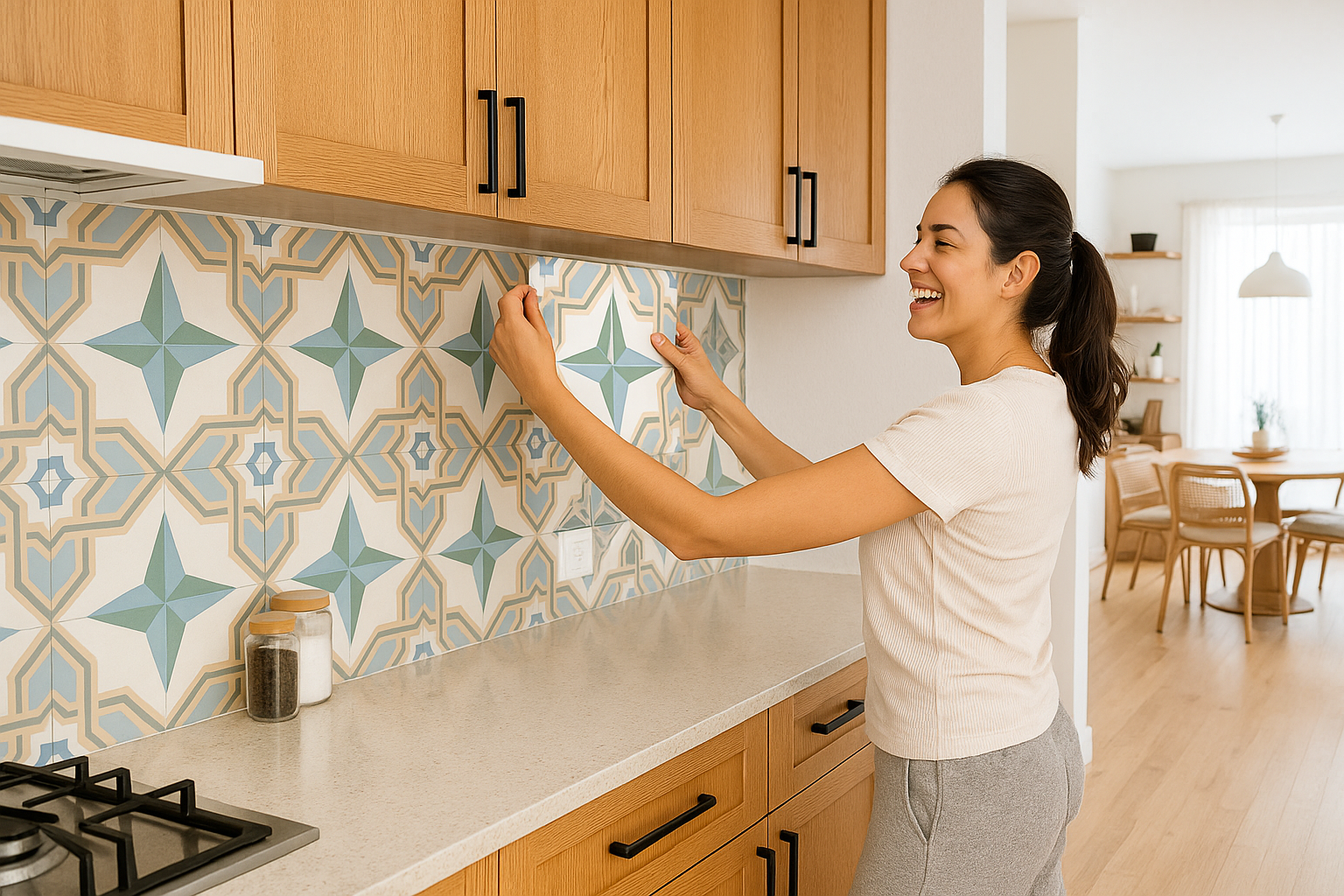 Tu cocina ahora luce renovada y con estilo. Disfruta del cambio inmediato que lograste tú misma, sin obras ni desorden, gracias a nuestras baldosas adhesivas resistentes al agua.
