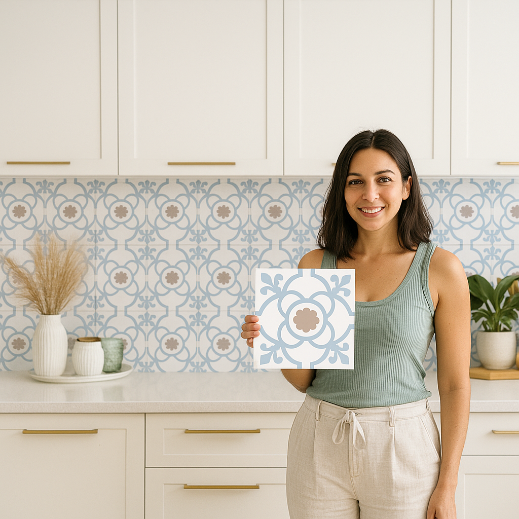 Sobre baldosas existentes: Si vas a usar las baldosas adhesivas sobre baldosas ya instaladas, mide una baldosa real completa (ancho y alto) para elegir el tamaño adecuado. Cuenta cuántas baldosas completas necesitas para cubrir el área y considera también las baldosas incompletas o medias en los bordes, contándolas como unidades completas para asegurar suficiente material.